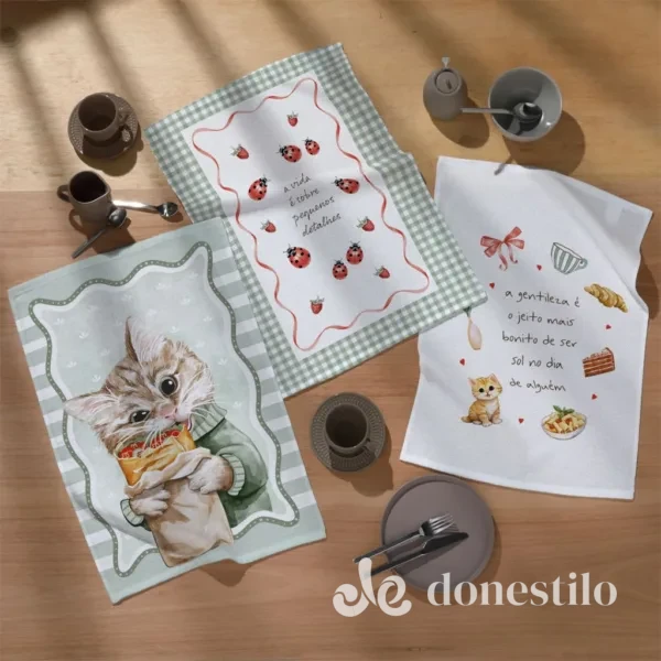 Adicione um toque de charme à sua cozinha com o Pano de Copa Prata Fofuras da Döhler. Este modelo apresenta estampas afetivas e cheias de personalidade, perfeitas para quem ama gatos e detalhes encantadores: