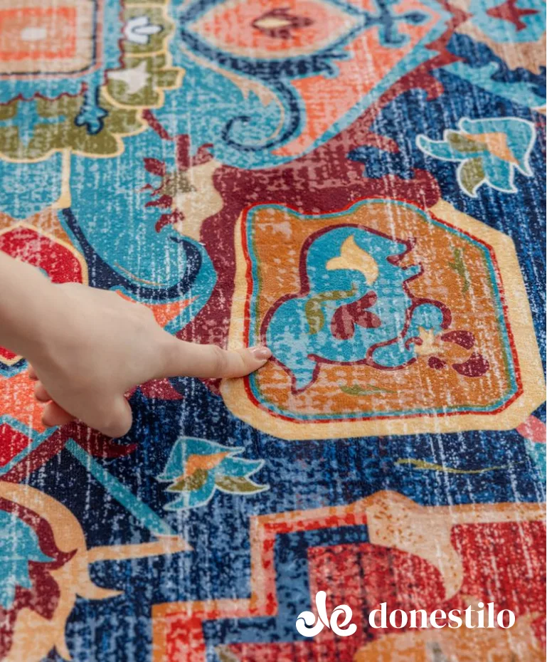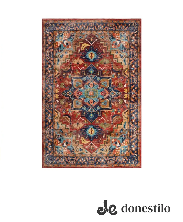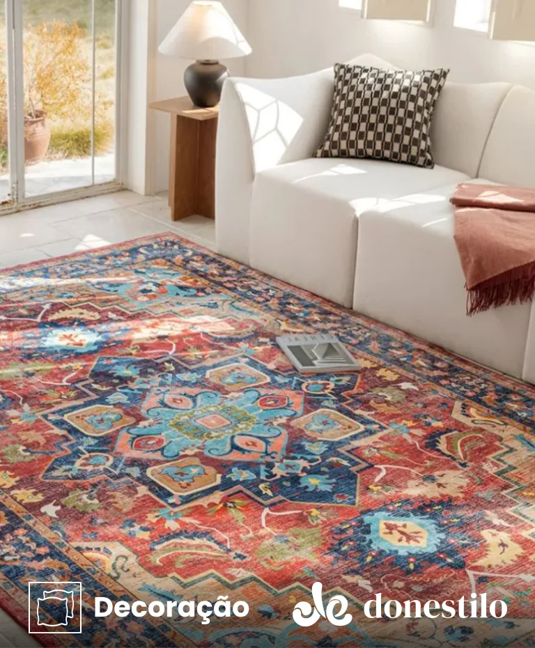 A estampa traz um design clássico e elegante, com medalhão central geométrico e linhas curvas. A paleta combina tons quentes de vermelho e terracota com azul e turquesa, criando um ambiente sofisticado e acolhedor.
