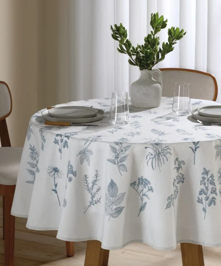 A Toalha de Mesa Renova Ciana redonda de 1,80m é indicada para mesas redondas de 6 a 8 lugares, criando um visual harmonioso e acolhedor.